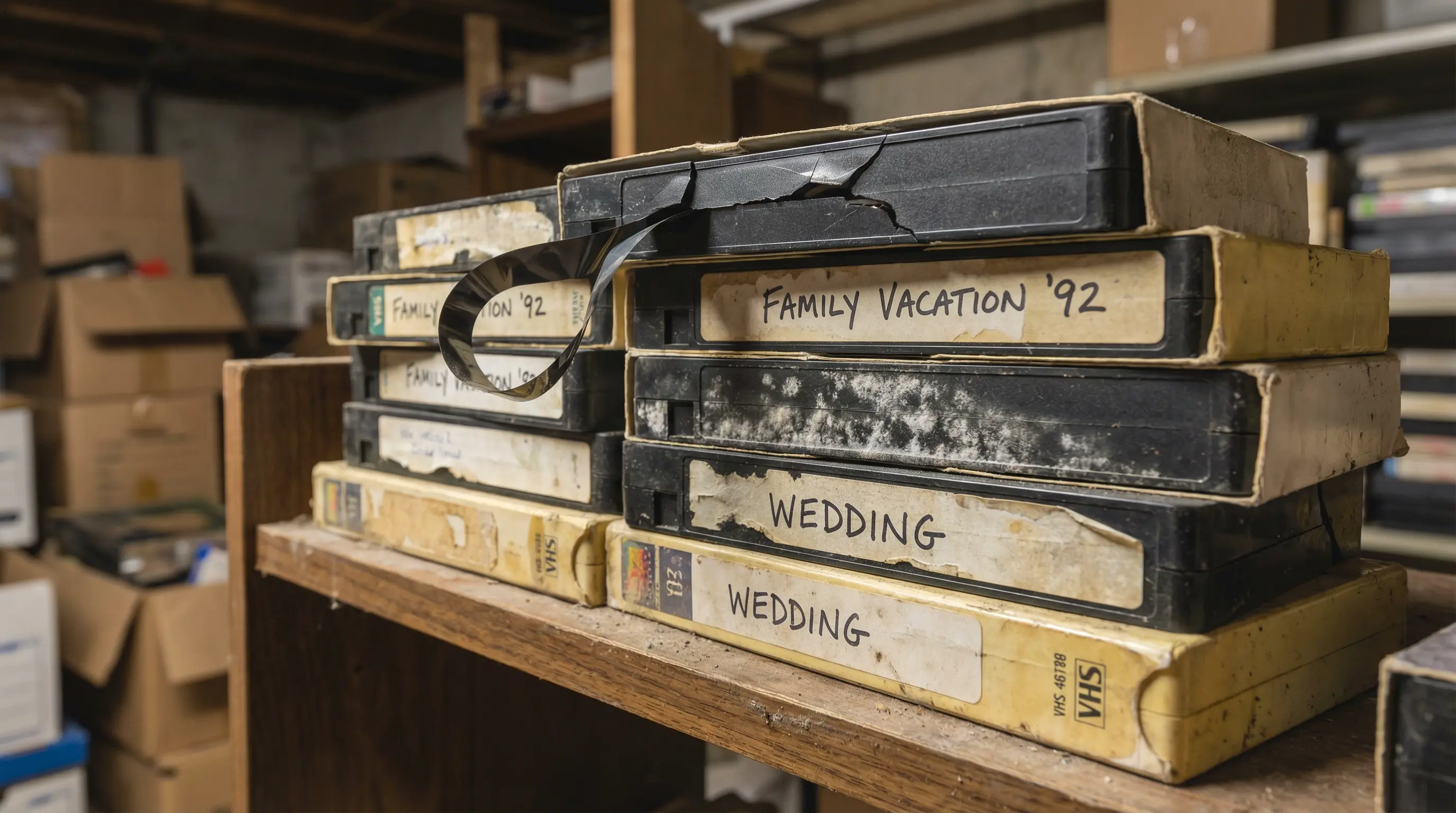 Deteriorating VHS tapes on shelf