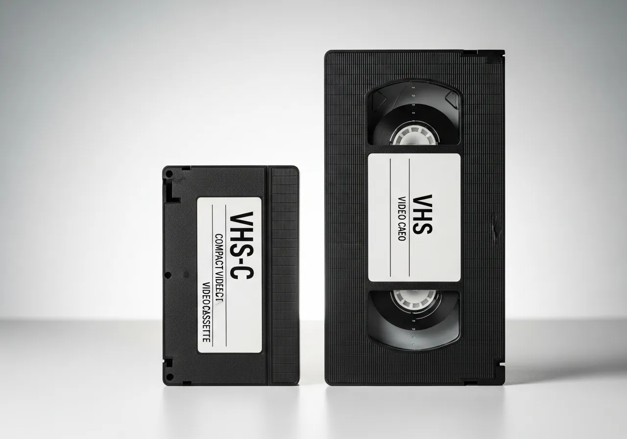 VHS-C compact cassette next to a standard VHS tape showing the size difference